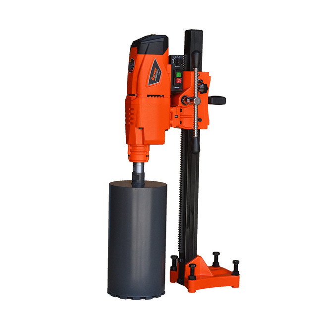 Виконавши попередню розмітку, за допомогою перфоратора або ударного дриля встановіть анкер, загвинтите в нього шпильку, на яку закріпіть станину . Після цього заведіть в пази корпус, зафіксуйте коронку. Налаштуйте систему подачі води: потік повинен бути помірним, щоб знизити температуру свердла і змити пил. Запустивши двигун, виконайте пробне дотик і надалі поступово збільшуйте натиск. Закінчивши операцію, зніміть бур і постукайте по ньому молотком, щоб видалити з порожнини продукт свердління.